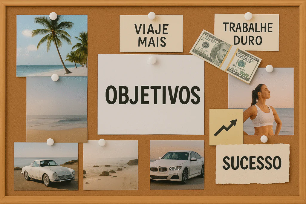 O moodboard pode ser online ou analógico e consiste em recortes de imagens e frases relacionados ao seu objetivo e que te ajudam na visualização, mas também a se inspirar .Linus+1Linus+1